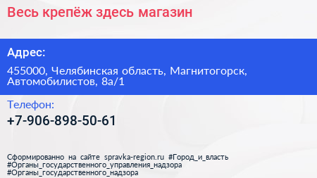 Весь крепёж здесь, магазин по адресу 455000, Челябинская область, Магнитогорск, Автомобилистов, 8а/1 в дальнейшем Организация, размещена в следующих категориях: