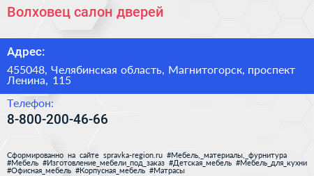 Волховец, салон дверей по адресу 455048, Челябинская область, Магнитогорск, проспект Ленина, 115 в дальнейшем Организация, размещена в следующих категориях: