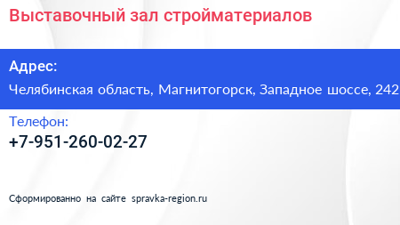 Выставочный зал стройматериалов по адресу Челябинская область, Магнитогорск, Западное шоссе, 242 в дальнейшем Организация, размещена в следующих категориях: