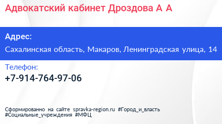 Адвокатский кабинет Дроздова А.А. по адресу Сахалинская область, Макаров, Ленинградская улица, 14 в дальнейшем Организация, размещена в следующих категориях:
