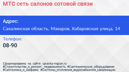 МТС, сеть салонов сотовой связи по адресу Сахалинская область, Макаров, Хабаровская улица, 14 в дальнейшем Организация, размещена в следующих категориях: