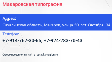 Макаровская типография по адресу Сахалинская область, Макаров, улица 50 лет Октября, 34 в дальнейшем Организация, размещена в следующих категориях: