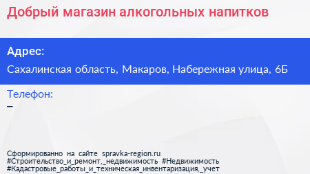 Добрый, магазин алкогольных напитков по адресу Сахалинская область, Макаров, Набережная улица, 6Б в дальнейшем Организация, размещена в следующих категориях: