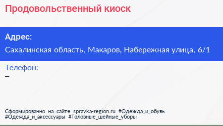Продовольственный киоск по адресу Сахалинская область, Макаров, Набережная улица, 6/1 в дальнейшем Организация, размещена в следующих категориях: