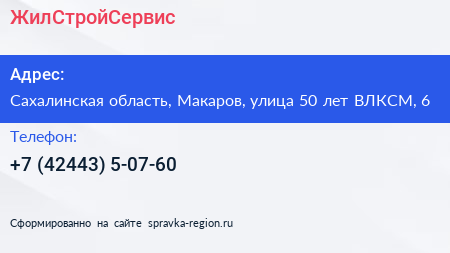 ЖилСтройСервис по адресу Сахалинская область, Макаров, улица 50 лет ВЛКСМ, 6 в дальнейшем Организация, размещена в следующих категориях: