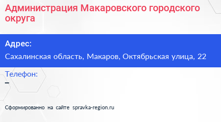 Администрация Макаровского городского округа по адресу Сахалинская область, Макаров, Октябрьская улица, 22 в дальнейшем Организация, размещена в следующих категориях: