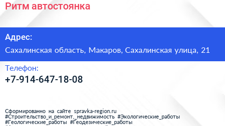 Ритм, автостоянка по адресу Сахалинская область, Макаров, Сахалинская улица, 21 в дальнейшем Организация, размещена в следующих категориях: