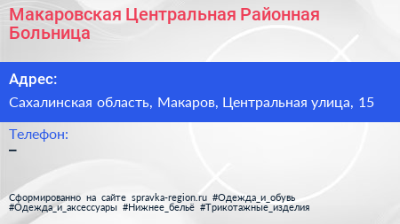 Макаровская Центральная Районная Больница по адресу Сахалинская область, Макаров, Центральная улица, 15 в дальнейшем Организация, размещена в следующих категориях: