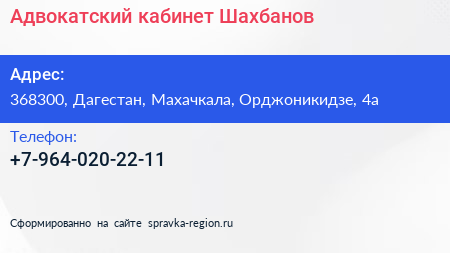 Адвокатский кабинет Шахбанов по адресу 368300, Дагестан, Махачкала, Орджоникидзе, 4а в дальнейшем Организация, размещена в следующих категориях: