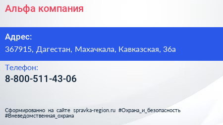 Альфа, компания по адресу 367915, Дагестан, Махачкала, Кавказская, 36а в дальнейшем Организация, размещена в следующих категориях: