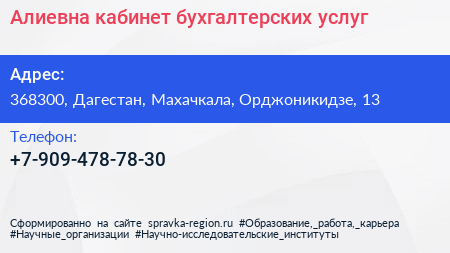 Алиевна, кабинет бухгалтерских услуг по адресу 368300, Дагестан, Махачкала, Орджоникидзе, 13 в дальнейшем Организация, размещена в следующих категориях: