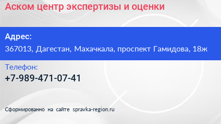 Аском, центр экспертизы и оценки по адресу 367013, Дагестан, Махачкала, проспект Гамидова, 18ж в дальнейшем Организация, размещена в следующих категориях: