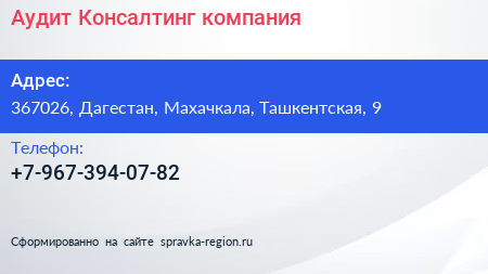 Аудит-Консалтинг, компания по адресу 367026, Дагестан, Махачкала, Ташкентская, 9 в дальнейшем Организация, размещена в следующих категориях: