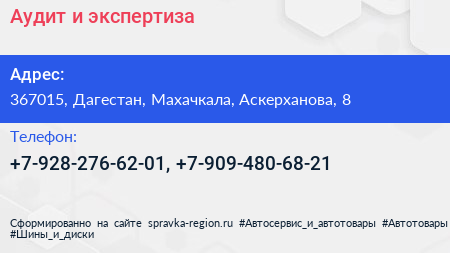 Аудит и экспертиза по адресу 367015, Дагестан, Махачкала, Аскерханова, 8 в дальнейшем Организация, размещена в следующих категориях: