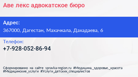 Аве лекс, адвокатское бюро по адресу 367000, Дагестан, Махачкала, Дахадаева, 6 в дальнейшем Организация, размещена в следующих категориях: