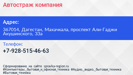 Автостраж, компания по адресу 367014, Дагестан, Махачкала, проспект Али-Гаджи Акушинского, 33а в дальнейшем Организация, размещена в следующих категориях: