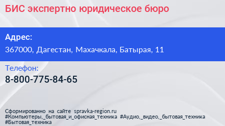 БИС, экспертно-юридическое бюро по адресу 367000, Дагестан, Махачкала, Батырая, 11 в дальнейшем Организация, размещена в следующих категориях: