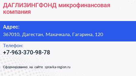 ДАГЛИЗИНГФОНД, микрофинансовая компания по адресу 367010, Дагестан, Махачкала, Гагарина, 120 в дальнейшем Организация, размещена в следующих категориях: