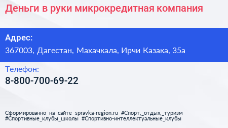 Деньги в руки, микрокредитная компания по адресу 367003, Дагестан, Махачкала, Ирчи Казака, 35а в дальнейшем Организация, размещена в следующих категориях: