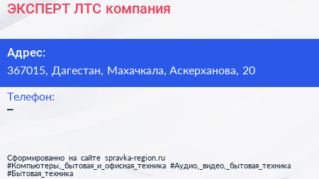 ЭКСПЕРТ-ЛТС, компания по адресу 367015, Дагестан, Махачкала, Аскерханова, 20 в дальнейшем Организация, размещена в следующих категориях: