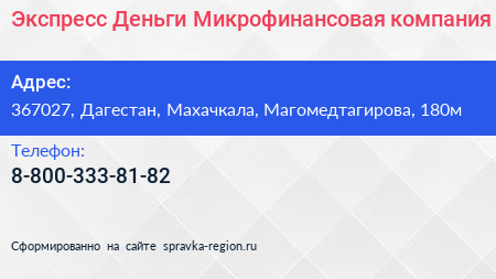 Экспресс Деньги, Микрофинансовая компания по адресу 367027, Дагестан, Махачкала, Магомедтагирова, 180м в дальнейшем Организация, размещена в следующих категориях: