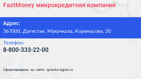 FastMoney, микрокредитная компания по адресу 367000, Дагестан, Махачкала, Коркмасова, 20 в дальнейшем Организация, размещена в следующих категориях: