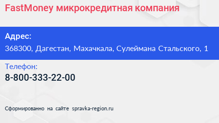 FastMoney, микрокредитная компания по адресу 368300, Дагестан, Махачкала, Сулеймана Стальского, 1 в дальнейшем Организация, размещена в следующих категориях: