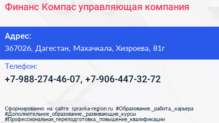 Финанс Компас, управляющая компания по адресу 367026, Дагестан, Махачкала, Хизроева, 81г в дальнейшем Организация, размещена в следующих категориях: