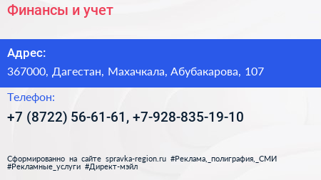 Финансы и учет по адресу 367000, Дагестан, Махачкала, Абубакарова, 107 в дальнейшем Организация, размещена в следующих категориях: