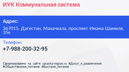 ИУК Коммунальная система по адресу 367015, Дагестан, Махачкала, проспект Имама Шамиля, 35е в дальнейшем Организация, размещена в следующих категориях: