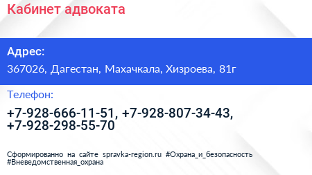 Кабинет адвоката по адресу 367026, Дагестан, Махачкала, Хизроева, 81г в дальнейшем Организация, размещена в следующих категориях: