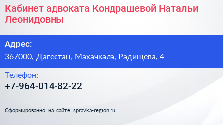 Кабинет адвоката Кондрашевой Натальи Леонидовны по адресу 367000, Дагестан, Махачкала, Радищева, 4 в дальнейшем Организация, размещена в следующих категориях: