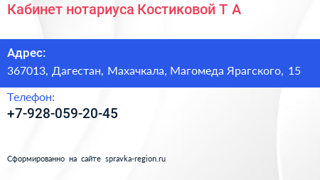 Кабинет нотариуса Костиковой Т.А. по адресу 367013, Дагестан, Махачкала, Магомеда Ярагского, 15 в дальнейшем Организация, размещена в следующих категориях: