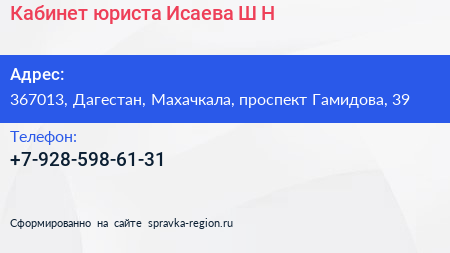 Кабинет юриста Исаева Ш.Н. по адресу 367013, Дагестан, Махачкала, проспект Гамидова, 39 в дальнейшем Организация, размещена в следующих категориях:
