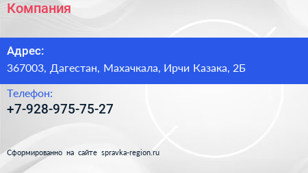 Компания по адресу 367003, Дагестан, Махачкала, Ирчи Казака, 2Б в дальнейшем Организация, размещена в следующих категориях: