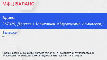 МФЦ БАЛАНС по адресу 367029, Дагестан, Махачкала, Абдулхакима Исмаилова, 1 в дальнейшем Организация, размещена в следующих категориях: