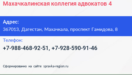Махачкалинская коллегия адвокатов №4 по адресу 367013, Дагестан, Махачкала, проспект Гамидова, 8 в дальнейшем Организация, размещена в следующих категориях: