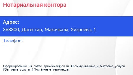 Нотариальная контора по адресу 368300, Дагестан, Махачкала, Хизроева, 1 в дальнейшем Организация, размещена в следующих категориях: