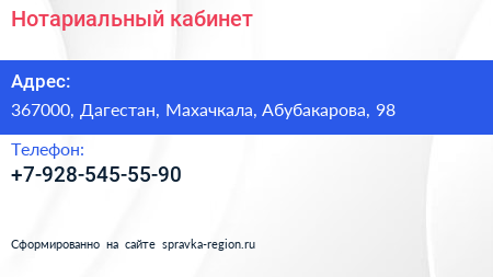 Нотариальный кабинет по адресу 367000, Дагестан, Махачкала, Абубакарова, 98 в дальнейшем Организация, размещена в следующих категориях: