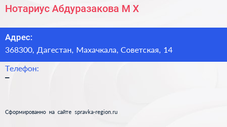 Нотариус Абдуразакова М.Х. по адресу 368300, Дагестан, Махачкала, Советская, 14 в дальнейшем Организация, размещена в следующих категориях: