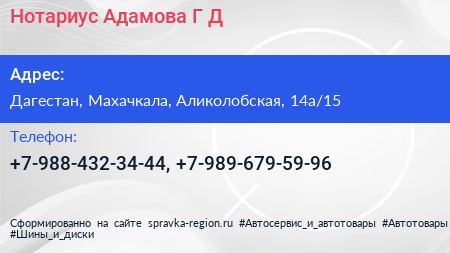 Нотариус Адамова Г.Д. по адресу Дагестан, Махачкала, Аликолобская, 14а/15 в дальнейшем Организация, размещена в следующих категориях: