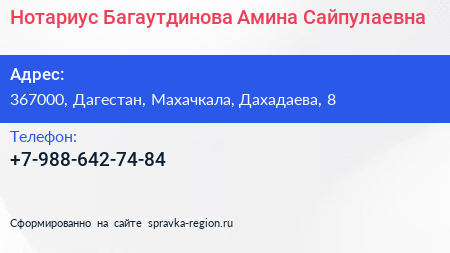 Нотариус Багаутдинова Амина Сайпулаевна по адресу 367000, Дагестан, Махачкала, Дахадаева, 8 в дальнейшем Организация, размещена в следующих категориях: