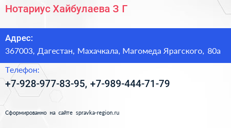 Нотариус Хайбулаева З.Г. по адресу 367003, Дагестан, Махачкала, Магомеда Ярагского, 80а в дальнейшем Организация, размещена в следующих категориях: