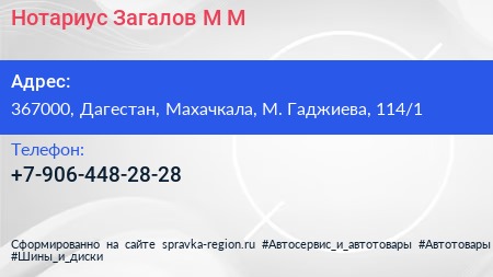 Нотариус Загалов М.М. по адресу 367000, Дагестан, Махачкала, М. Гаджиева, 114/1 в дальнейшем Организация, размещена в следующих категориях: