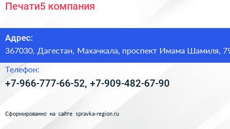 Печати5, компания по адресу 367030, Дагестан, Махачкала, проспект Имама Шамиля, 79 в дальнейшем Организация, размещена в следующих категориях: