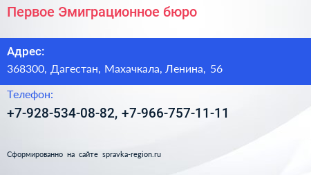 Первое Эмиграционное бюро по адресу 368300, Дагестан, Махачкала, Ленина, 56 в дальнейшем Организация, размещена в следующих категориях:
