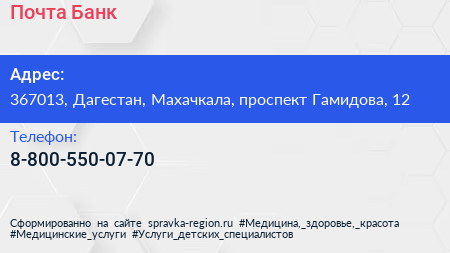 Почта Банк по адресу 367013, Дагестан, Махачкала, проспект Гамидова, 12 в дальнейшем Организация, размещена в следующих категориях: