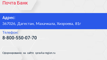 Почта Банк по адресу 367026, Дагестан, Махачкала, Хизроева, 81г в дальнейшем Организация, размещена в следующих категориях: