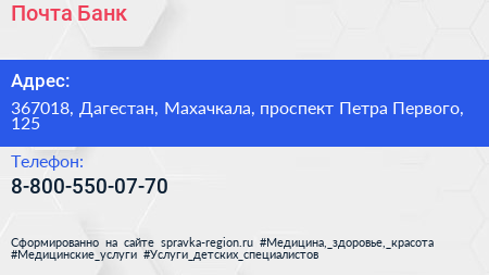 Почта Банк по адресу 367018, Дагестан, Махачкала, проспект Петра Первого, 125 в дальнейшем Организация, размещена в следующих категориях:
