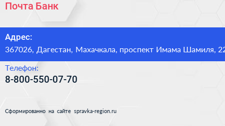 Почта Банк по адресу 367026, Дагестан, Махачкала, проспект Имама Шамиля, 22 в дальнейшем Организация, размещена в следующих категориях: